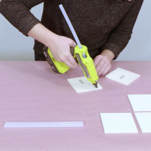 Aloita asettamalla ensimmäinen kaakeli sileä puoli alaspäin-, smooth side down. Levitä kuumaliimaa yhteen sivuun. Ota toinen laatta ja aseta se liiman päälle, niin että sileä puoli jää taas ulos. Pidä laattaa noin 20 sekuntia, jotta liimaa kuivaa ja kovettuu. Liimaa loput laatat niin, että neliönmallisen ruukun reunat muodostuvat.
