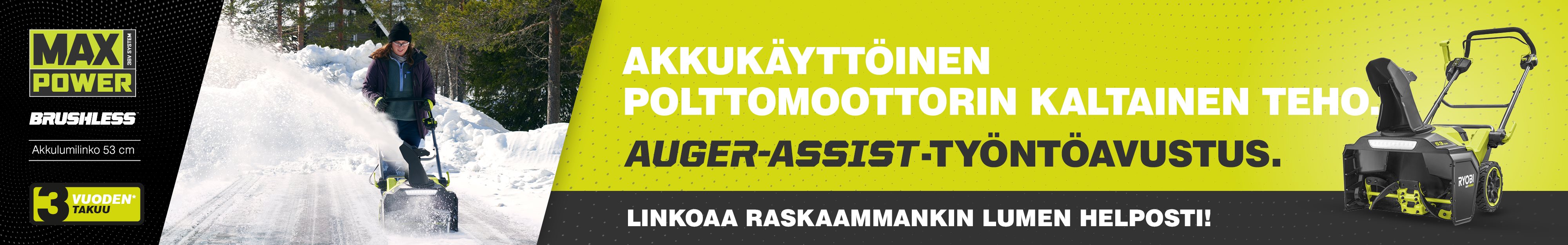 RYOBI MAX POWER -lumilinko tekee lumenpoistosta nopeampaa ja helpompaa edistyksellisen lumensyöttökierukan avulla tapahtuvan Auger Assist -ajoavustuksen ansiosta. Tämä linko on täydellinen ratkaisu kulkuväylien pitämiseen puhtaana lumesta koko talvikauden ajan.